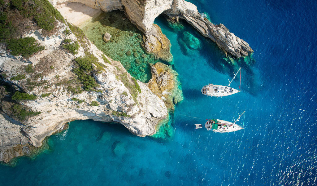 Paxos is a tapestry of silvery olive groves, emerald waters, and rugged coastline. The western cliffs hide magical sea caves, arches, and dome-shaped rock formations, while the east offers gentle bays framed by cypress and olive trees.