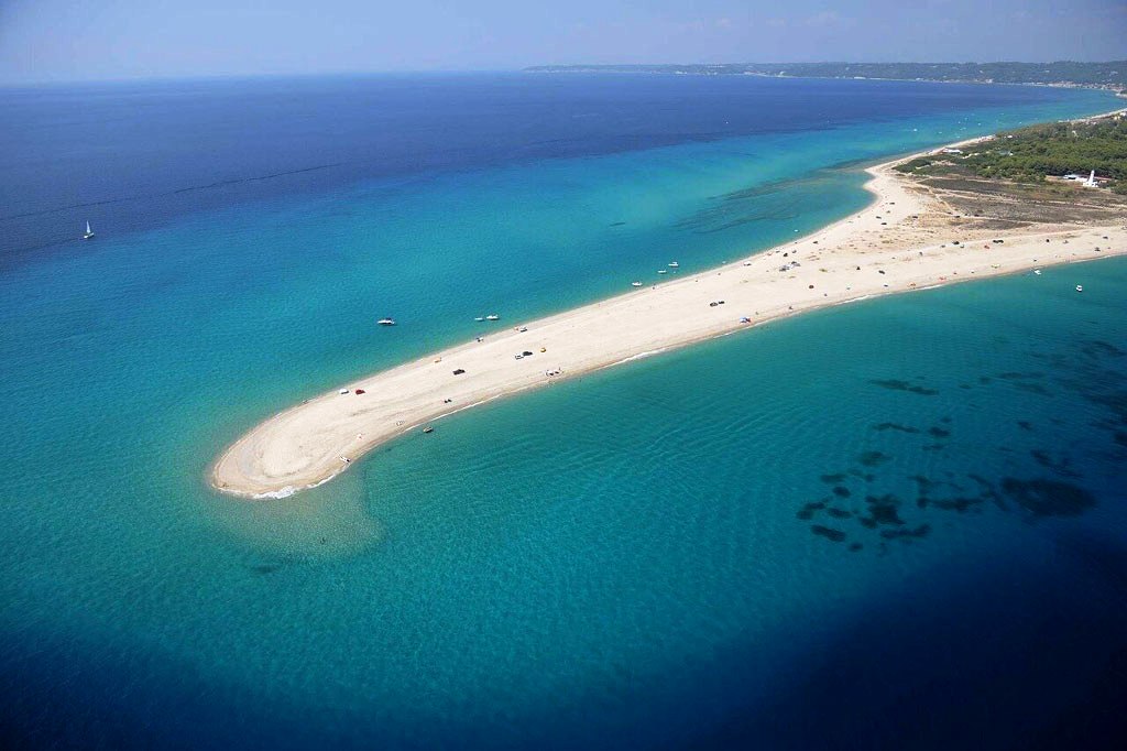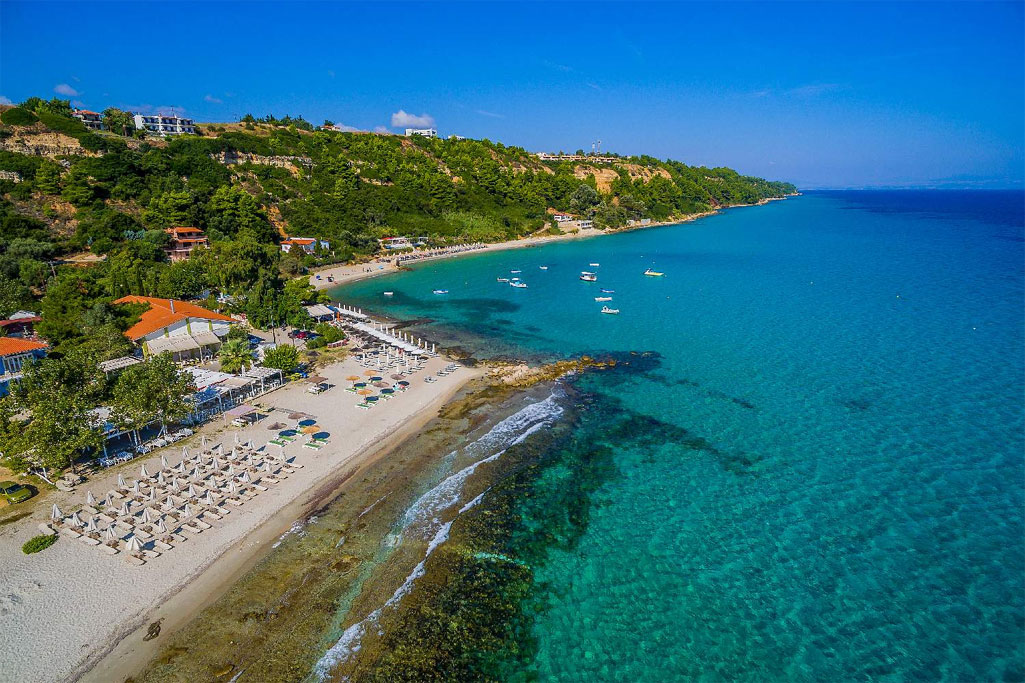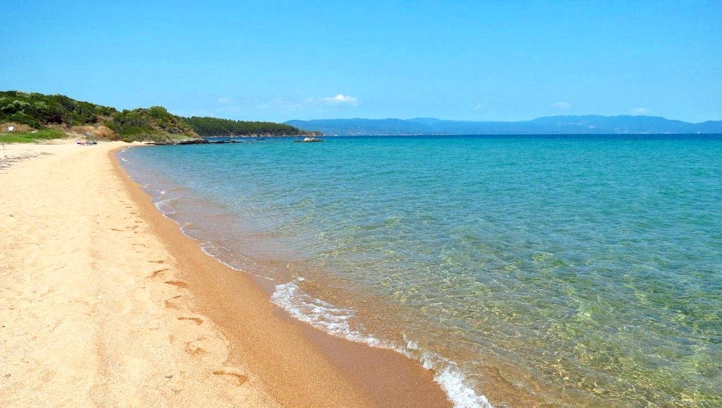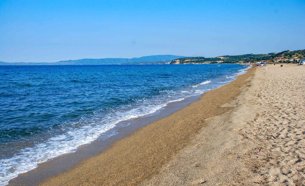 This golden-sand beach lies just before the border of Mount Athos, offering calm waters and a relaxed atmosphere, with views of the holy peninsula.