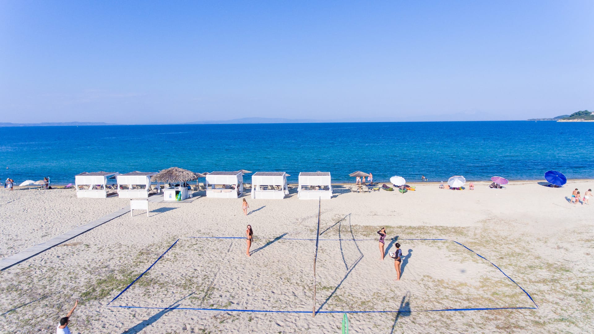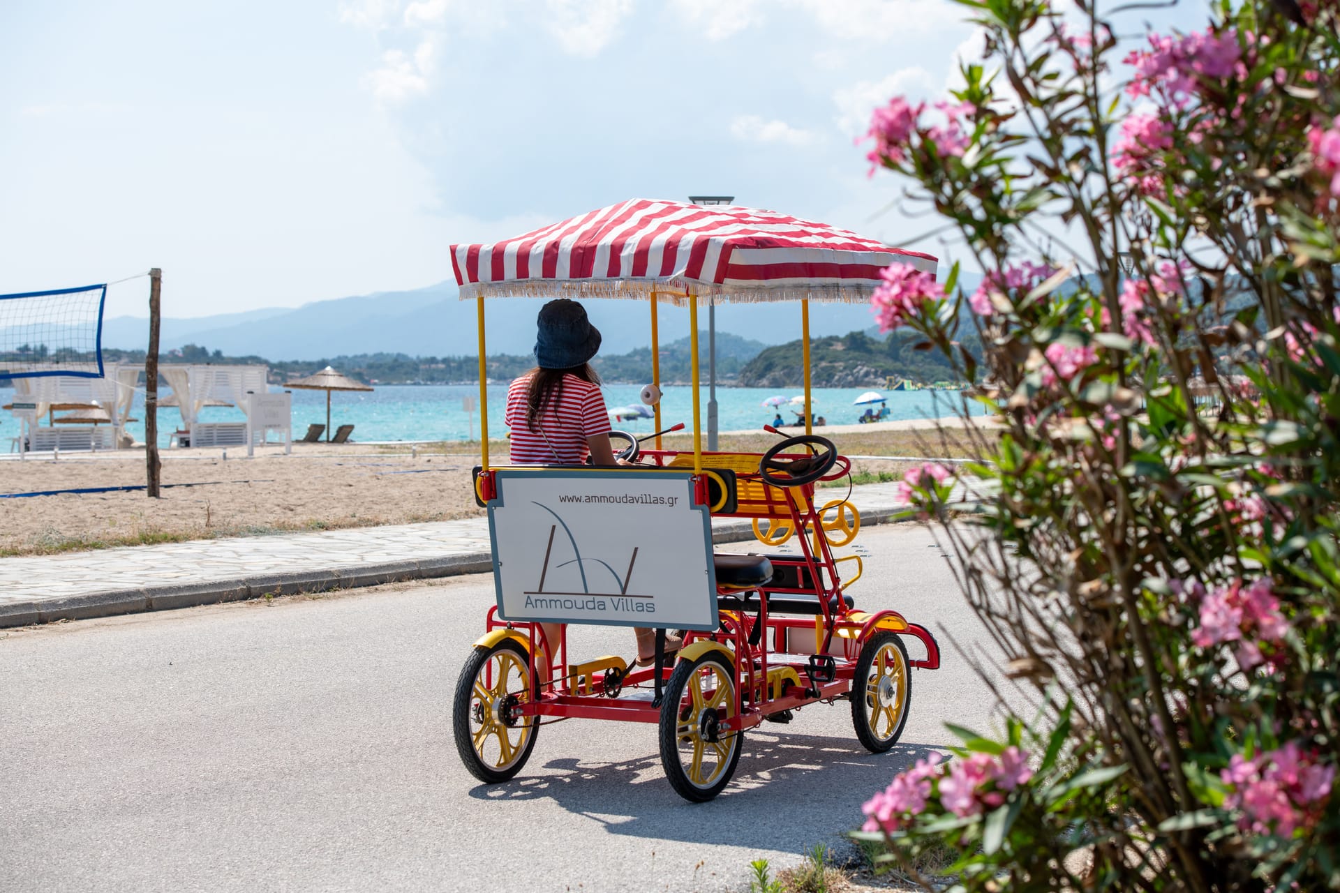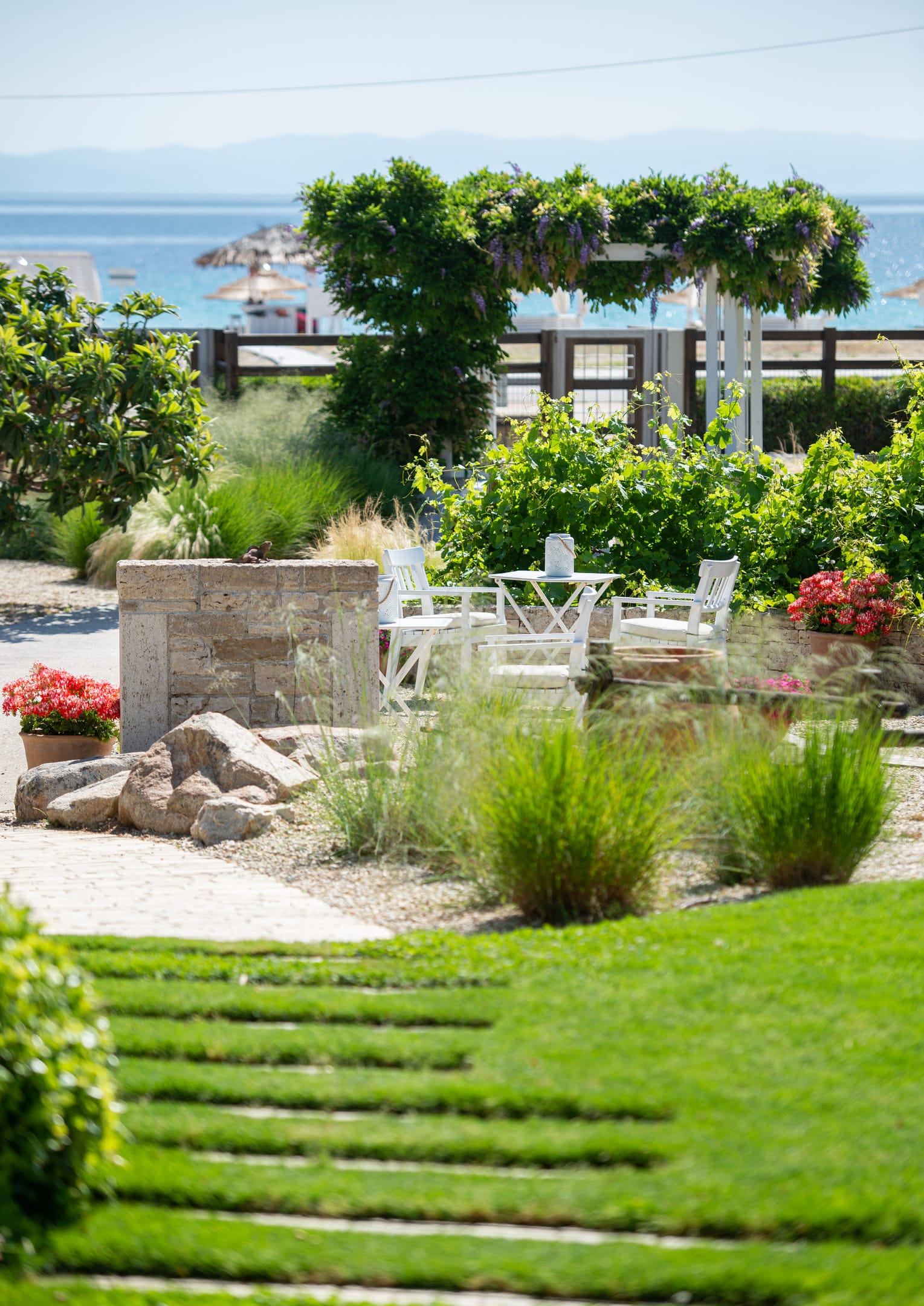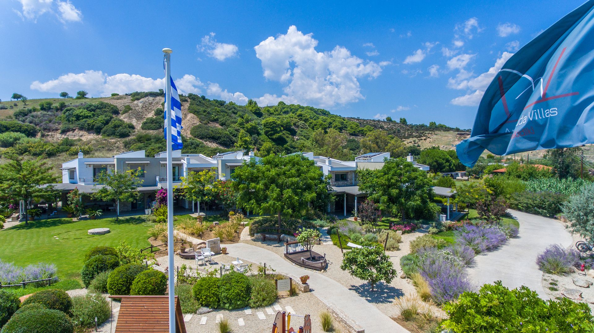 Ammouda Villas takes full advantage of its unique location: the resort's garden is just a few meters from a vast sandy beach, offering uninterrupted views of the sapphire sea, the port of Ormos Panagias, and the Mount Athos peninsula.