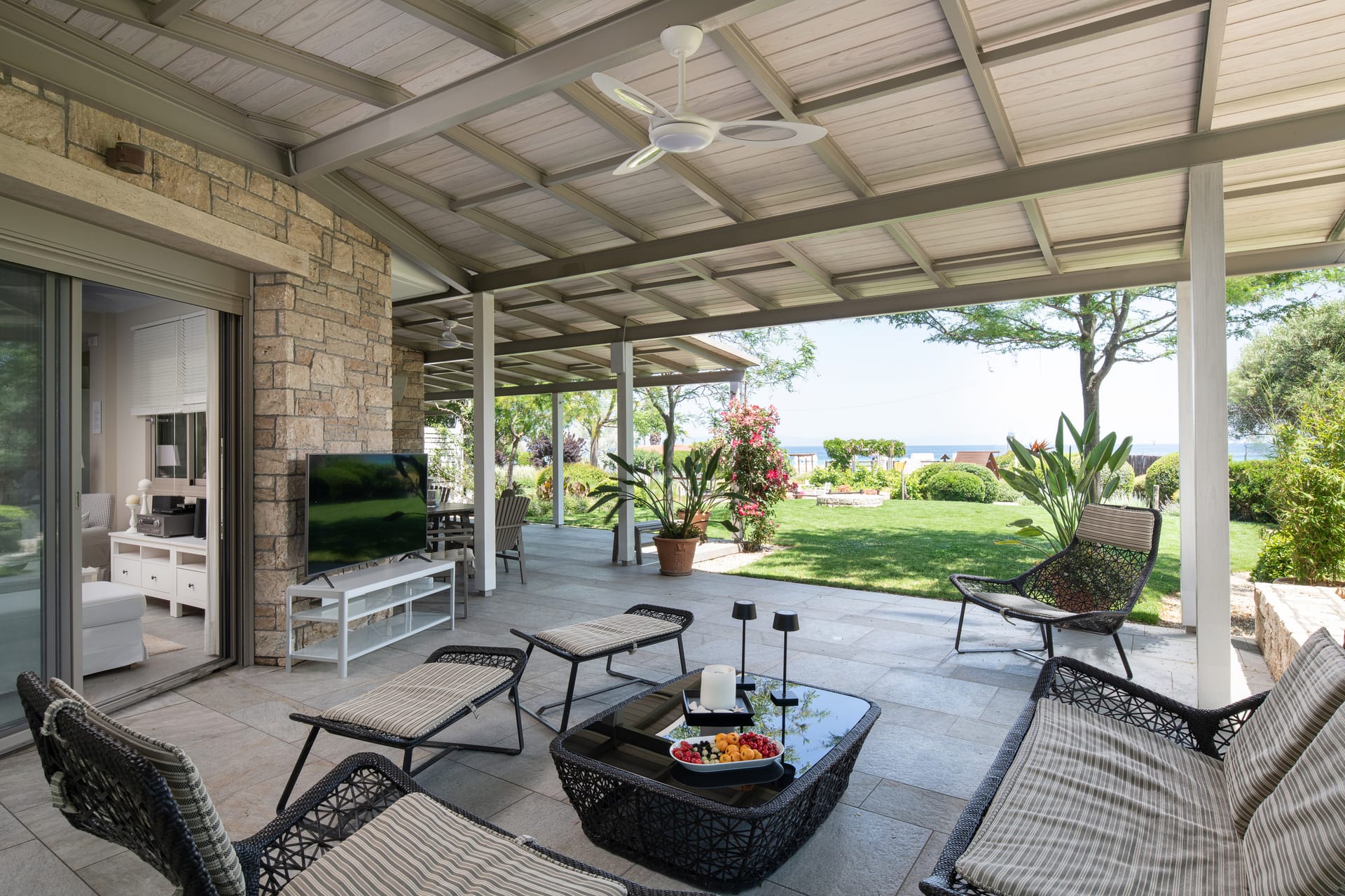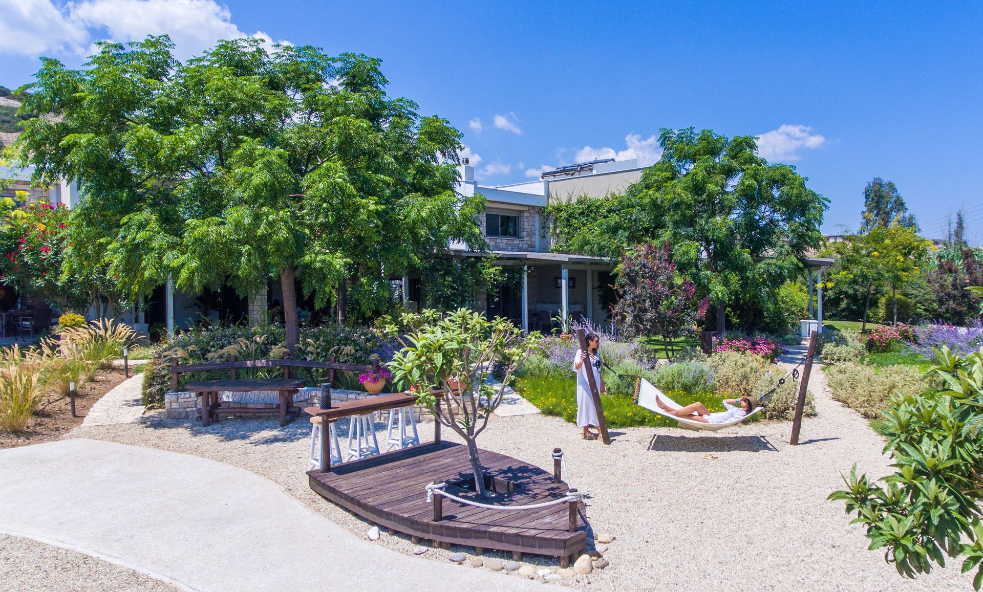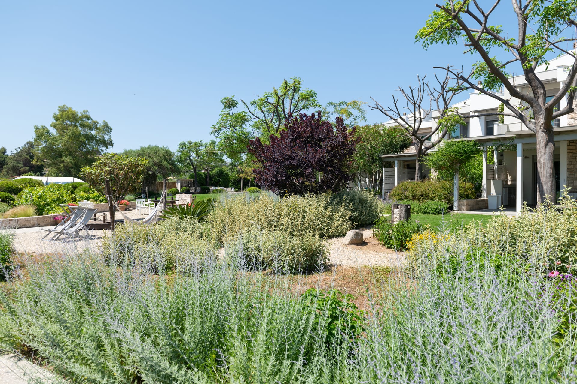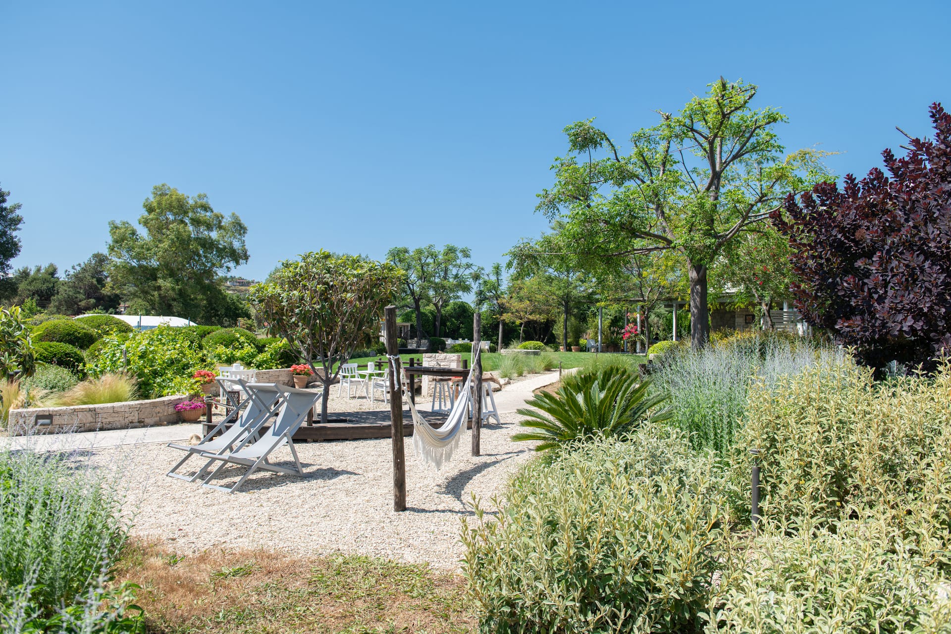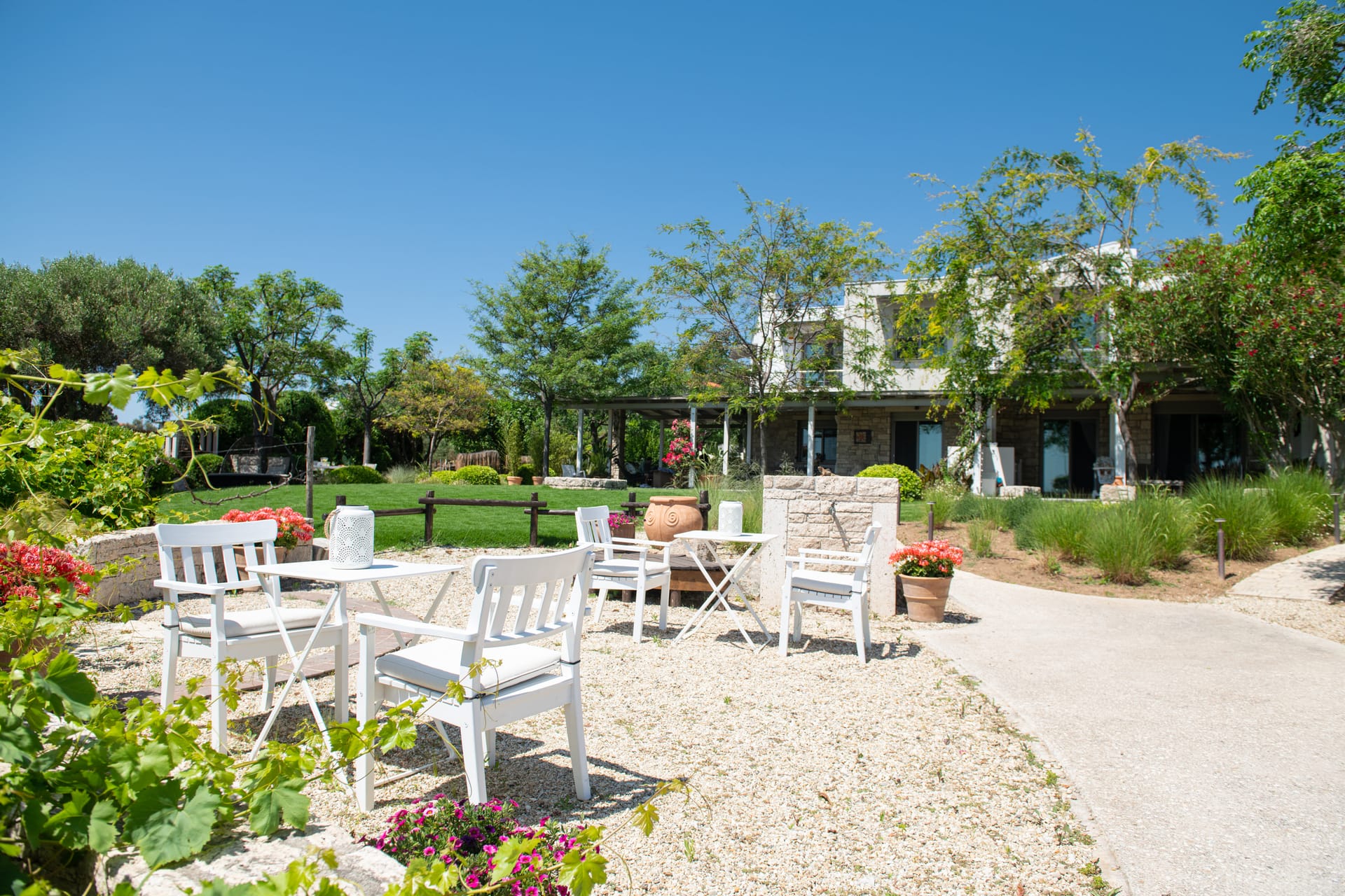 Ammouda Villas takes full advantage of its unique location: the resort's garden is just a few meters from a vast sandy beach, offering uninterrupted views of the sapphire sea, the port of Ormos Panagias, and the Mount Athos peninsula.