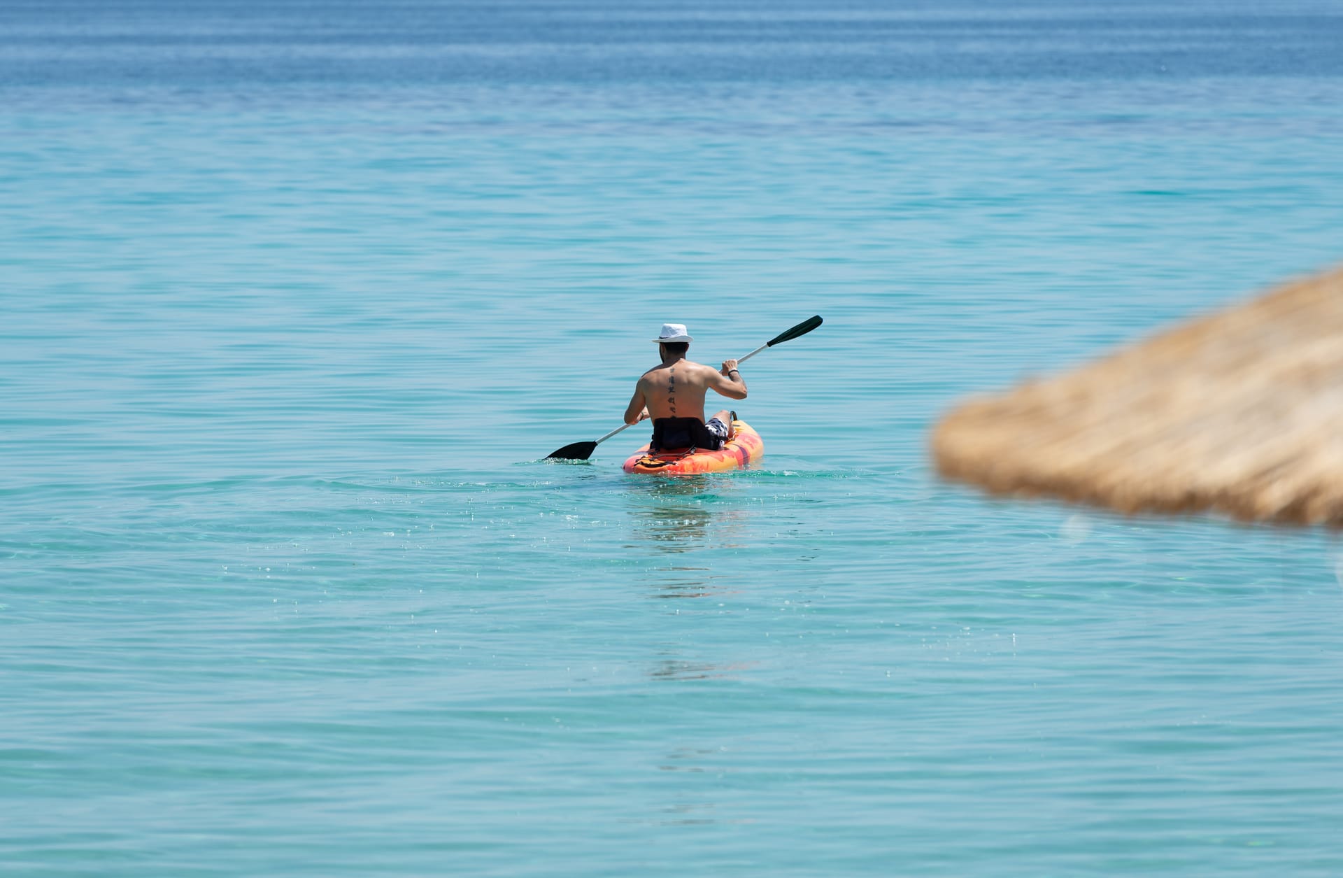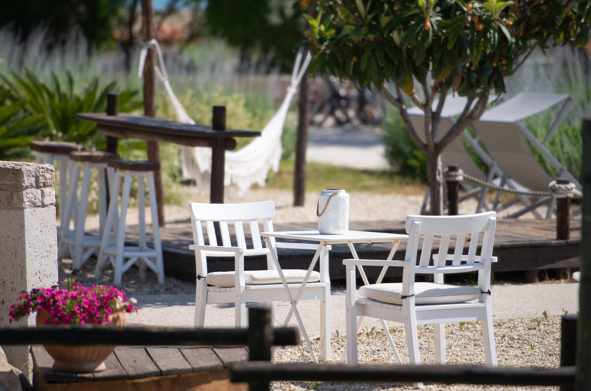 Crystal-clear waters and a 500-square-meter private beach with white sand are right at your doorstep! Each villa has a beach gazebo, as shown in the photos below. It includes a comfortable three-seater sofa, four chairs, and a table. Directly in front of it are two sets of umbrellas, four sun loungers with leather cushions and headrests, and two tables on our beautiful, fully equipped sandy beach. Each double room has an umbrella, table, and two sun loungers with leather cushions and headrests, ready for your next swim.