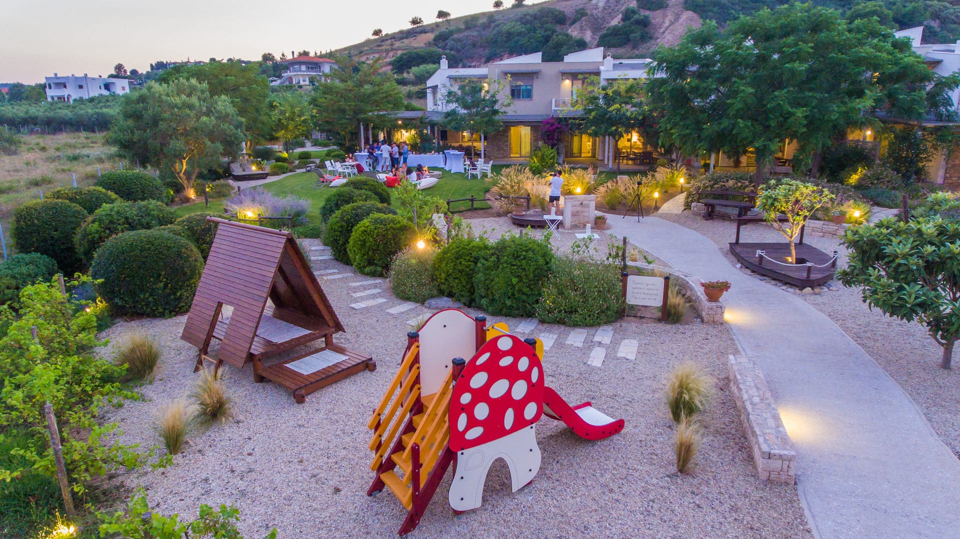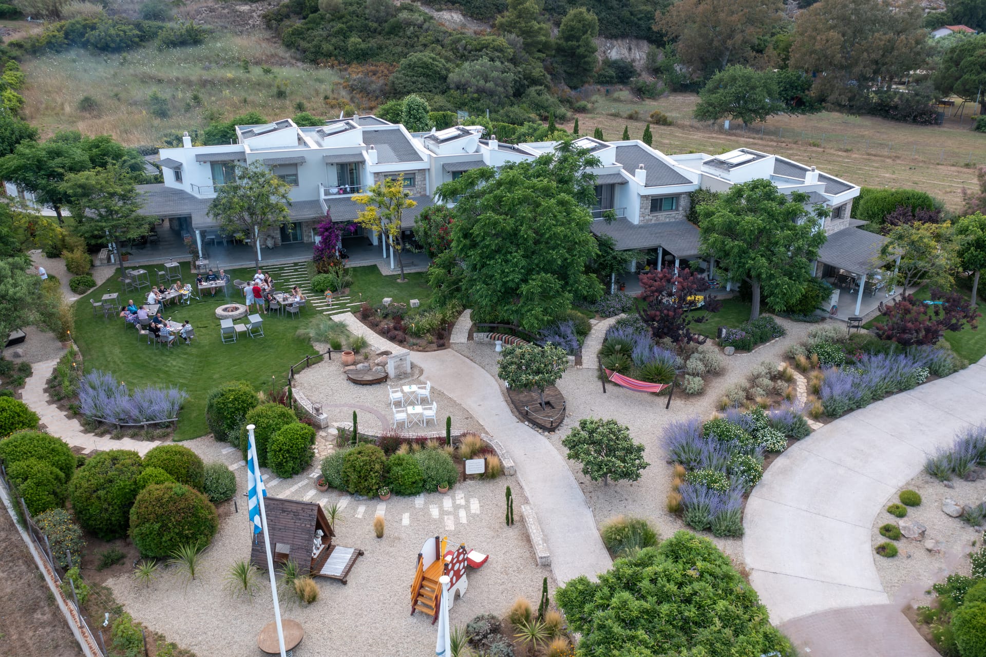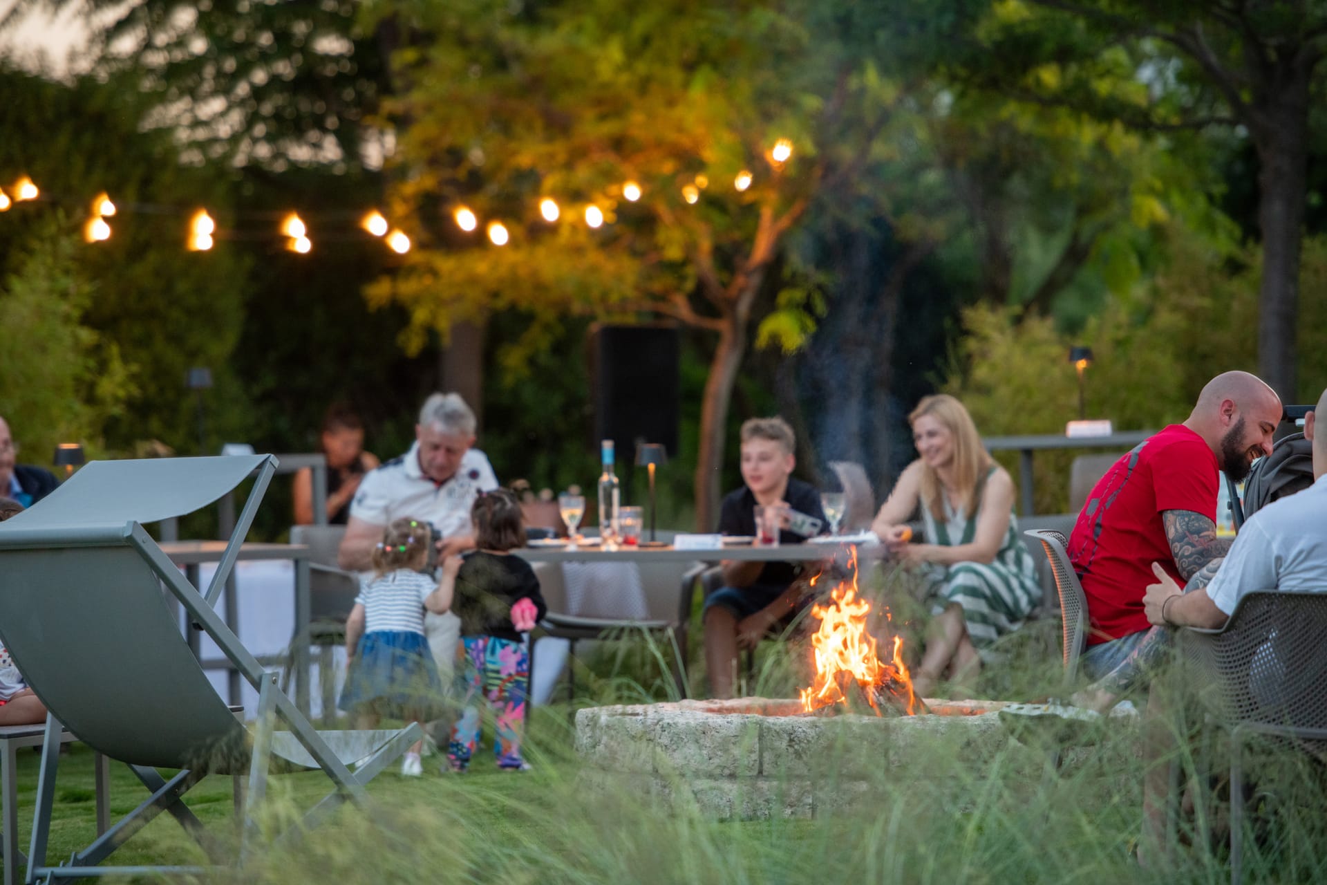 An impromptu bonfire party in the garden, sometimes accompanied by the sounds of Greek music, a glass of good wine, fresh fruit, and a variety of snacks.