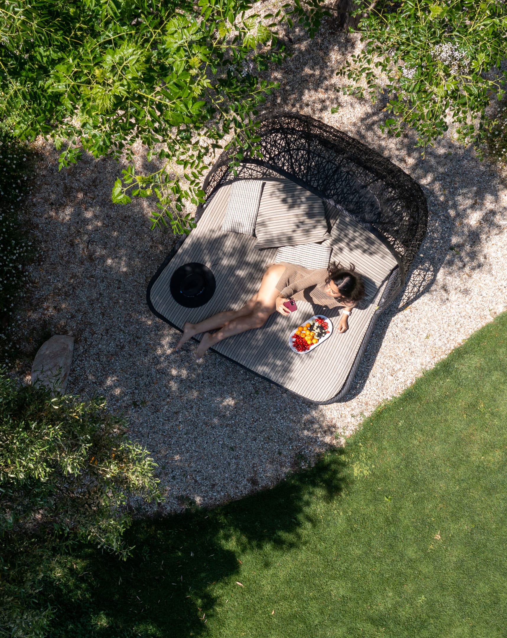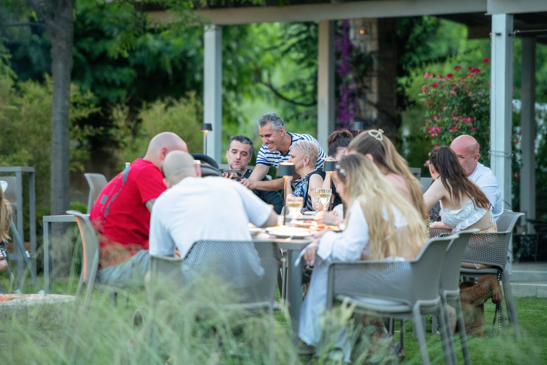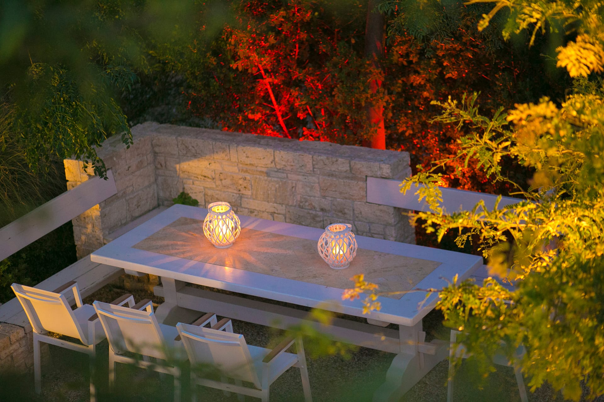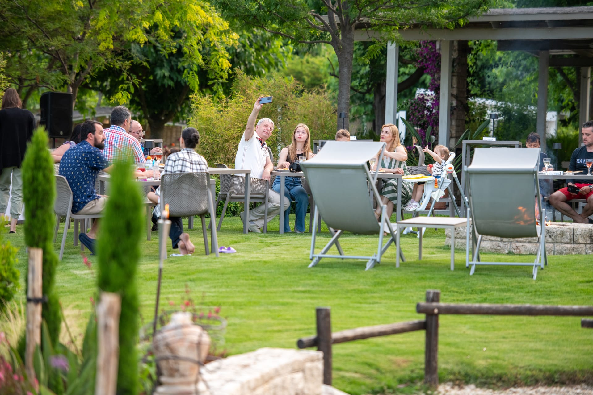 An impromptu bonfire party in the garden, sometimes accompanied by the sounds of Greek music, a glass of good wine, fresh fruit, and a variety of snacks.