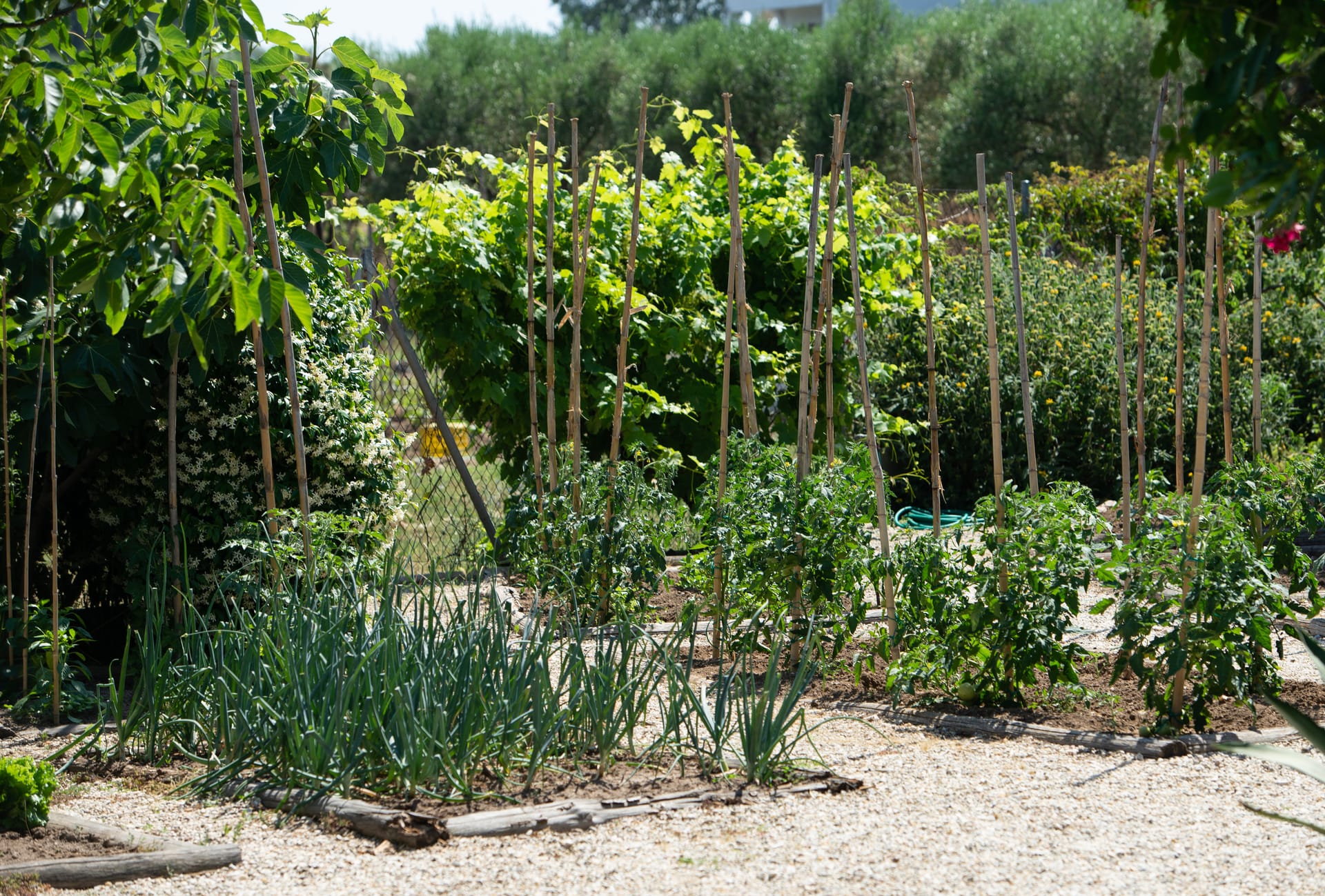 A beautiful, colorful organic garden with freshly picked vegetables is at your disposal. You can use your basket of beautiful tops to pick tomatoes, cherry tomatoes, cucumbers, green and hot peppers, lettuce, chives, basil, mint, thyme, oregano, rosemary, or whatever else you like to create your own delicious salad!