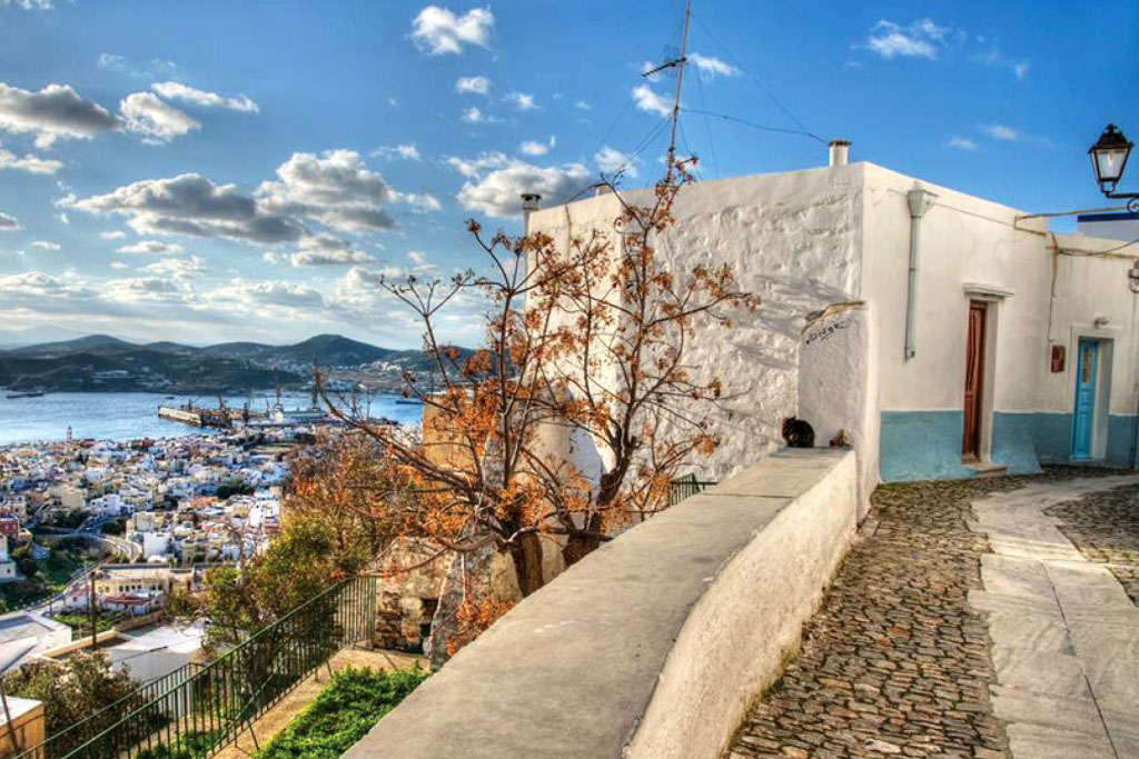The Cycladic island of Syros, with its imposing beauty, charms all visitors. The alternations of landscapes, the fertile plains that pop up from abrupt mountainous volumes and her natural wealth are elements composing the magic of the island. The island has a rich and cultured past where authentic Greek traditions harmoniously coexist with more Western influences.